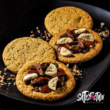 Con banano liofilizado, caramelo salado, ganache de café espresso y nueces pecanas